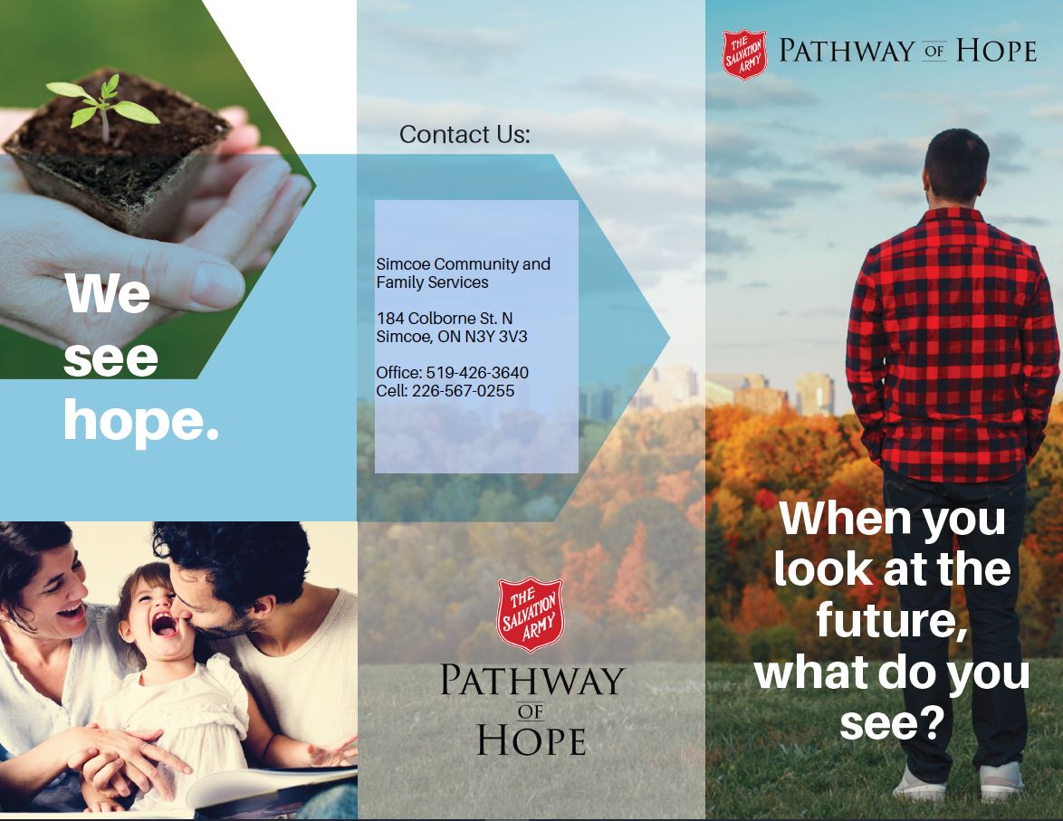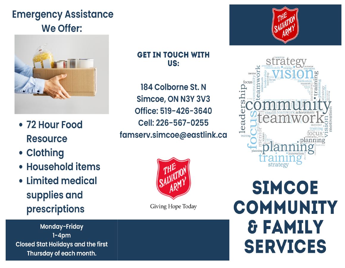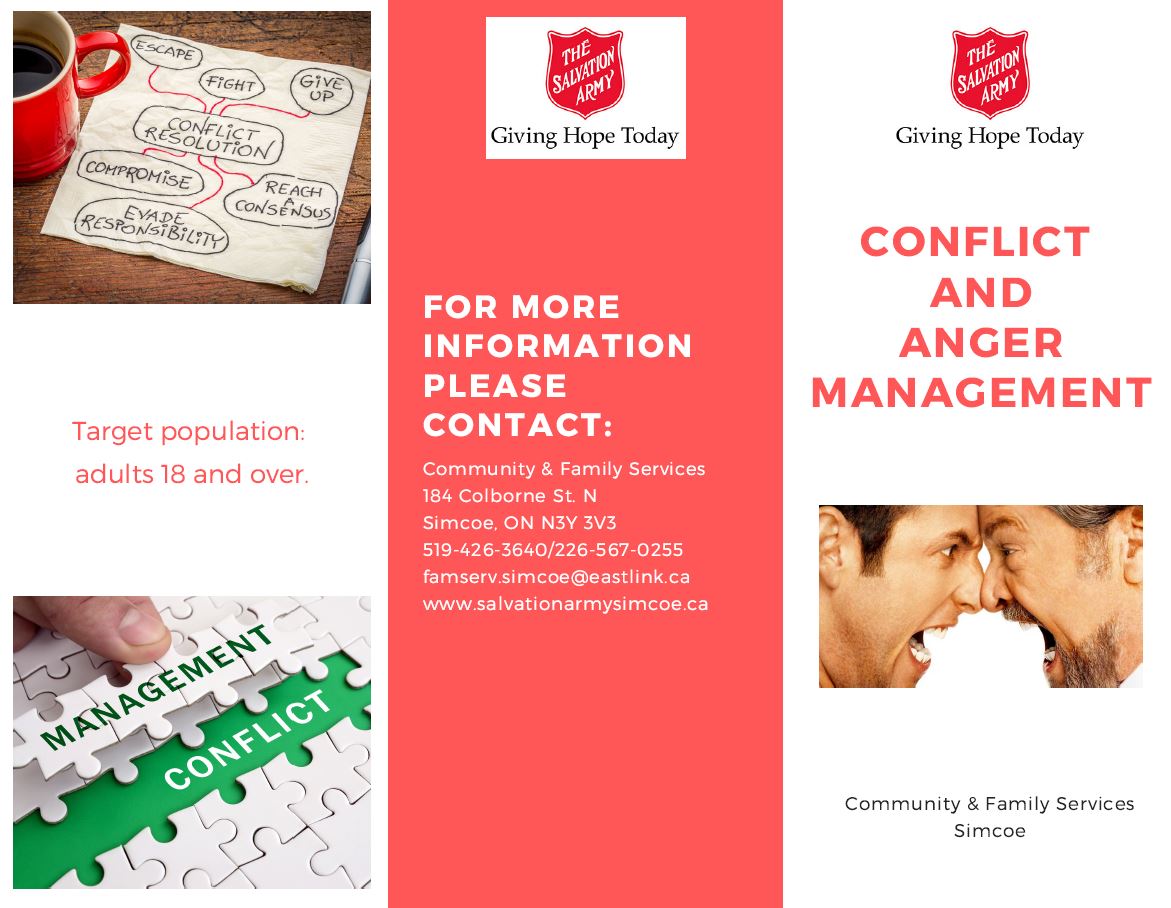 Community Programs Our list of programs is always growing! See the list below for more details: • Family Services Brochure (updated July 2023) • Community Program Descriptions (updated July 2023) • Haldimand & Norfolk Health Unit - Emergency & Low Cost Support (updated Mar. 2023) • Pathway of Hope brochure (updated July 2023) • Red Cap Anger Management (8-12 years) brochure (updated July 2023) • Teen Anger Management sKills (TASK - 14-17 years) brochure (updated July 2023) • Conflict & Anger Management (18+ years) brochure (updated July 2023) For more information on any of the above community programs, please call Family Services at (519) 426-3640 or e-mail simcoe.cfs@salvationarmy.ca.